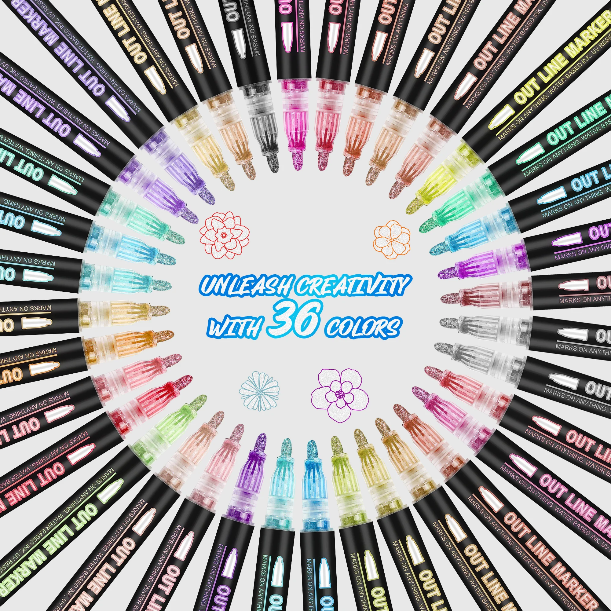 Double Line Metallic Outline Markers - 36 Vibrant Colors, Self-Outline Metallic Markers with Quick-Drying Ink, Double Line Metallic Markers for Kids & Adults